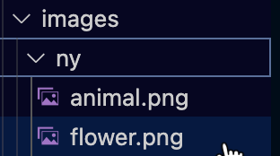 When we render the project, the image path updates to /images/ny/flower.png pointing to the existing flower image in the ny directory: